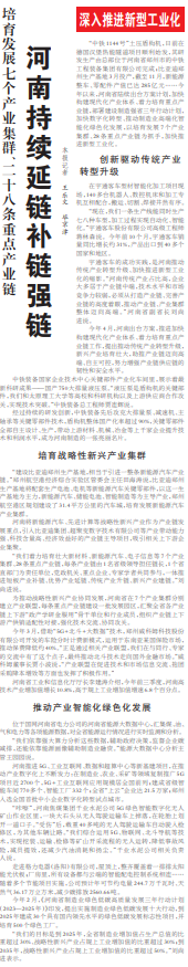 “中铁1144号”土压盾构机,日前在德国汉堡热能隧道项目顺利始发,其研发生产由总部位于河南省郑州市的中铁工程装备集团有限公司完成;比亚迪郑州生产基地3月投产,截至11月,新能源整车、零配件产值已达285亿元……今年以来,河南省陆续出台方案计划,加快构建现代化产业体系、着力培育重点产业链,部署建设制造强省三年行动计划,加快数字化转型、推动制造业高端化智能化绿色化发展,以培育发展7个产业集群、28条重点产业链为抓手,加快推进新型工业化。(今日《人民日报》2版)
