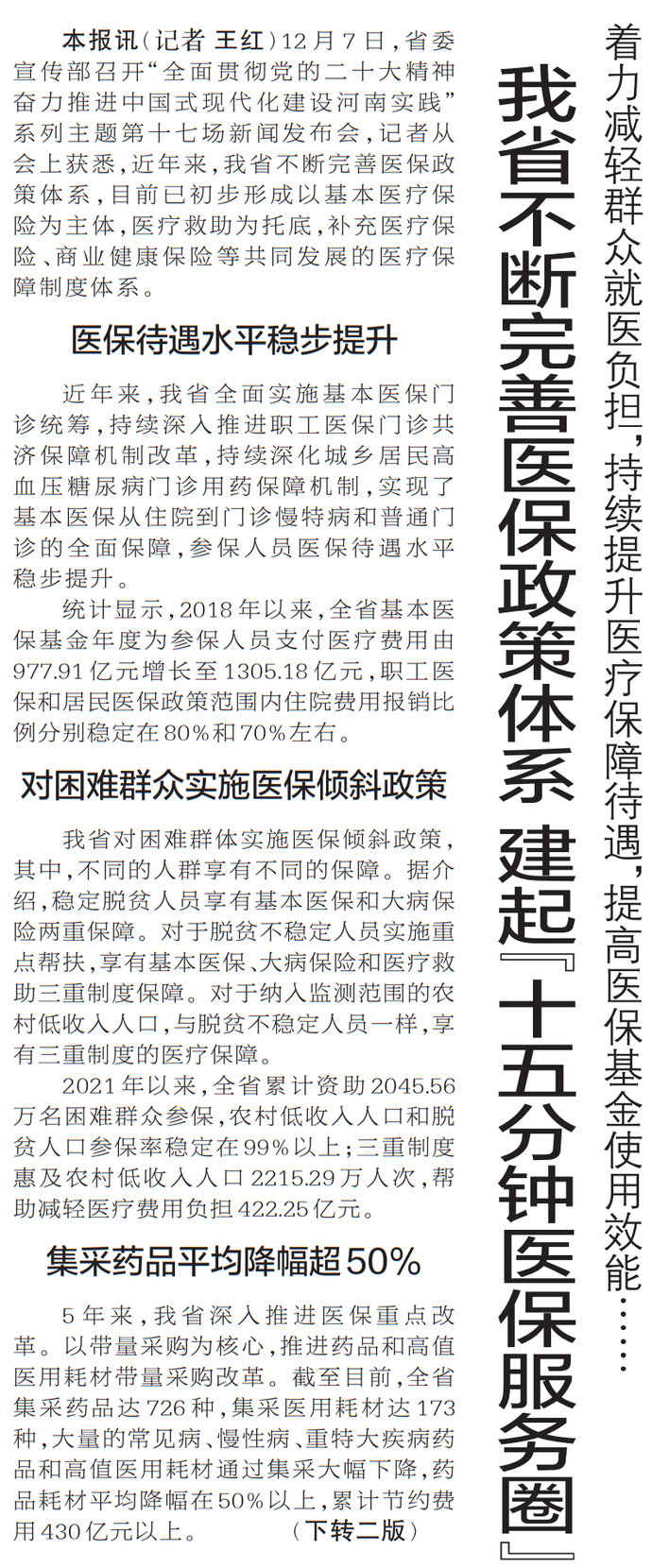 12月7日,省委宣传部召开“全面贯彻党的二十大精神 奋力推进中国式现代化建设河南实践”系列主题第十七场新闻发布会,记者从会上获悉,近年来,我省不断完善医保政策体系,目前已初步形成以基本医疗保险为主体,医疗救助为托底,补充医疗保险、商业健康保险等共同发展的医疗保障制度体系。(今日《郑州日报》1版、2版)