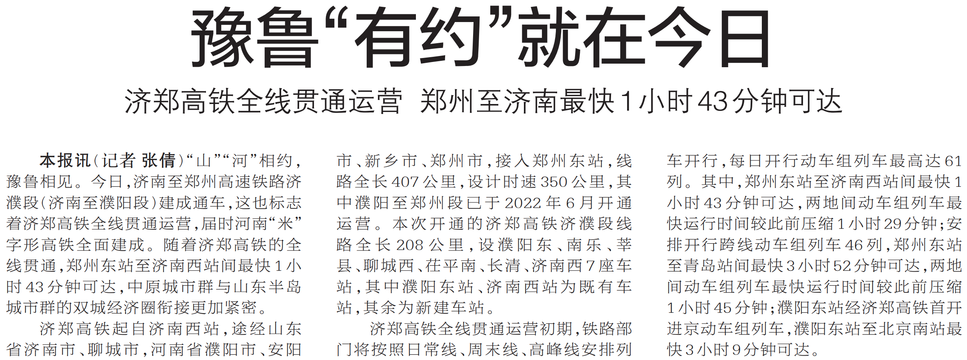 “山”“河”相约,豫鲁相见。今日,济南至郑州高速铁路济濮段(济南至濮阳段)建成通车,这也标志着济郑高铁全线贯通运营,届时河南“米”字形高铁全面建成。随着济郑高铁的全线贯通,郑州东站至济南西站间最快1小时43分钟可达,中原城市群与山东半岛城市群的双城经济圈衔接更加紧密。(今日《郑州日报》1版)