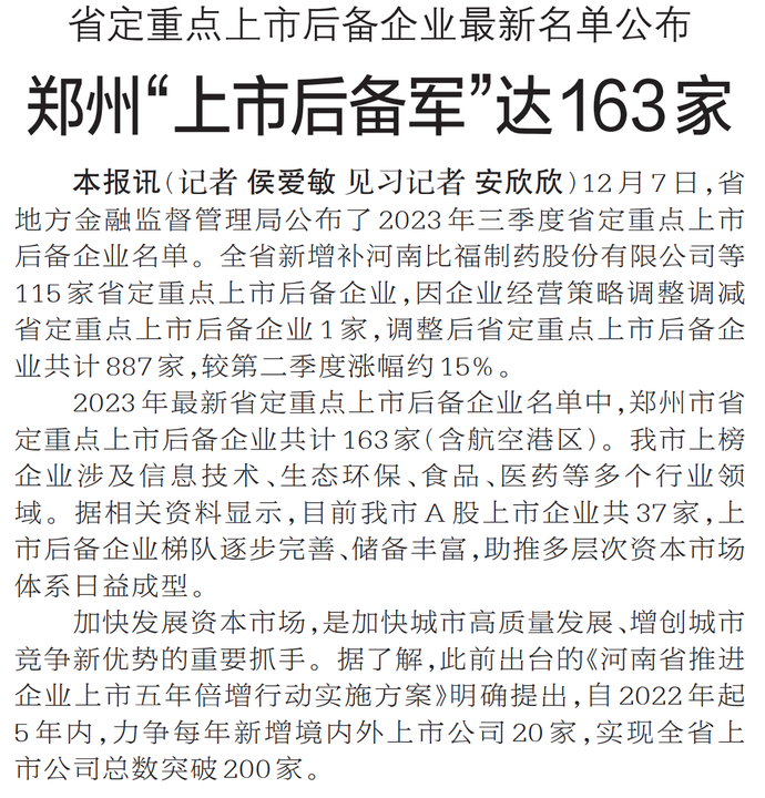 12月7日,省地方金融监督管理局公布了2023年三季度省定重点上市后备企业名单。全省新增补河南比福制药股份有限公司等115家省定重点上市后备企业,因企业经营策略调整调减省定重点上市后备企业1家,调整后省定重点上市后备企业共计887家,较第二季度涨幅约15%。(今日《郑州日报》1版)