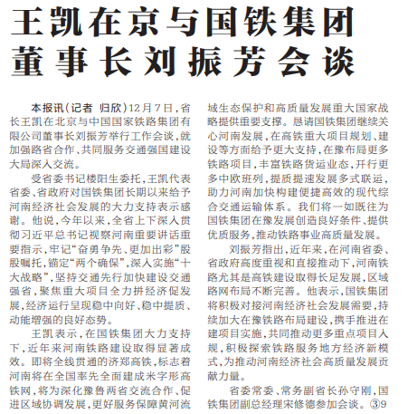12月7日,省长王凯在北京与中国国家铁路集团有限公司董事长刘振芳举行工作会谈,就加强路省合作、共同服务交通强国建设大局深入交流。(今日《河南日报》1版)