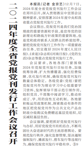 12月7日,2024年度全省党报党刊发行工作会议在郑州召开,深入贯彻落实中宣部会议精神要求,安排部署2024年度中央和我省重点党报党刊发行工作。(今日《河南日报》1版)