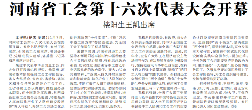12月7日,河南省工会第十六次代表大会在郑州开幕。省委书记楼阳生、省长王凯出席,全国总工会副主席、书记处书记、党组成员朱建平,省委副书记孙梅君出席并讲话。(今日《河南日报》1版)