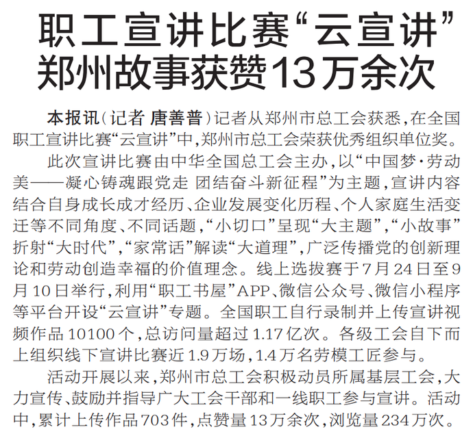 记者从郑州市总工会获悉,在全国职工宣讲比赛“云宣讲”中,郑州市总工会荣获优秀组织单位奖。(今日《郑州日报》2版)