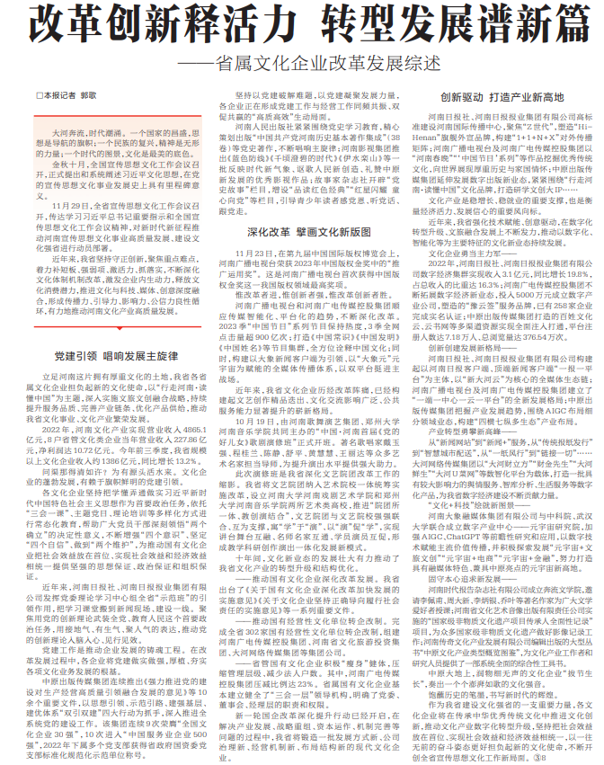 近年来,我省坚持守正创新,聚焦重点难点,着力补短板、强弱项、激活力、抓落实,不断深化文化体制机制改革,激发企业内生动力,释放文化消费潜力,推进文化与科技、媒体、创意深度融合,形成传播力、引导力、影响力、公信力良性循环,有力地推动河南文化产业高质量发展。(今日《河南日报》2版)