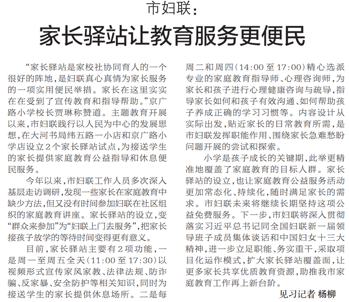 “家长驿站是家校社协同育人的一个很好的阵地,是妇联真心真情为家长服务的一项实用便民举措。家长在这里实实在在受到了宣传教育和指导帮助。”京广路小学校长贾琳称赞道。主题教育开展以来,市妇联践行以人民为中心的发展思想,在大河书局纬五路一小店和京广路小学店设立2个家长驿站试点,为接送学生的家长提供家庭教育公益指导和休息便民服务。(今日《郑州日报》2版)