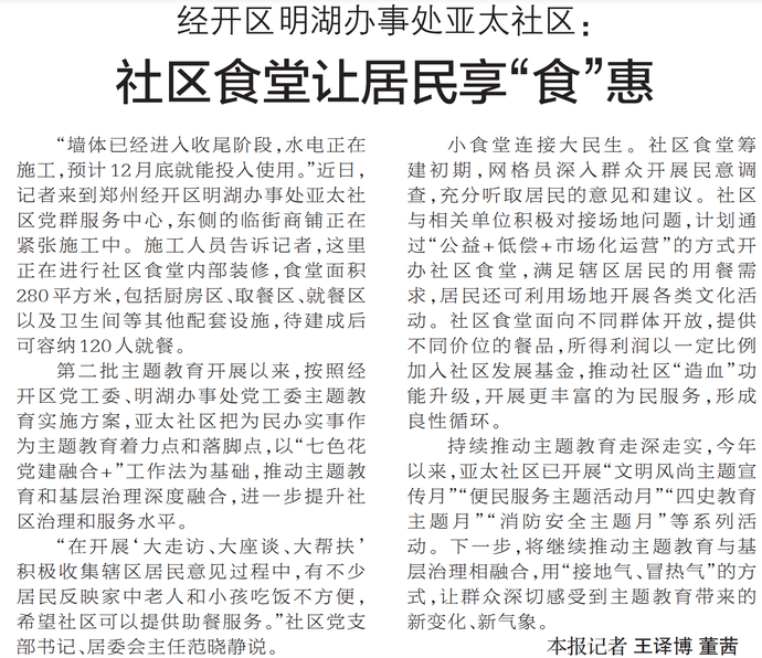 “墙体已经进入收尾阶段,水电正在施工,预计12月底就能投入使用。”近日,记者来到郑州经开区明湖办事处亚太社区党群服务中心,东侧的临街商铺正在紧张施工中。施工人员告诉记者,这里正在进行社区食堂内部装修,食堂面积280平方米,包括厨房区、取餐区、就餐区以及卫生间等其他配套设施,待建成后可容纳120人就餐。(今日《郑州日报》2版)