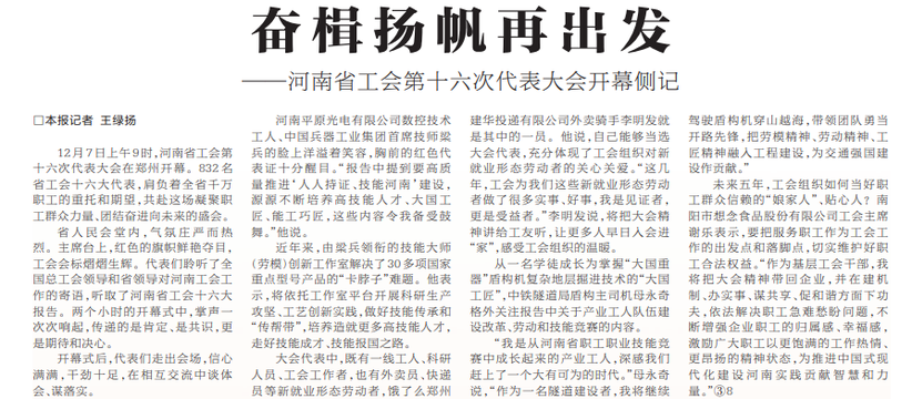 12月7日上午9时,河南省工会第十六次代表大会在郑州开幕。832名省工会十六大代表,肩负着全省千万职工的重托和期望,共赴这场凝聚职工群众力量、团结奋进向未来的盛会。(今日《河南日报》3版)