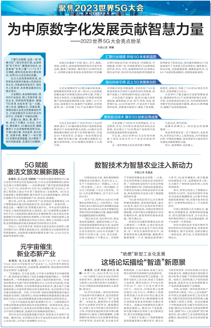汇聚行业翘楚,这是一场“高峰对话”;强化科技引领,这是体现“实干担当”;聚焦前沿技术,这是彰显“未来力量”——12月7日傍晚,顺利完成各项主要议程后,世界5G大会在郑州闭幕。(今日《郑州日报》3版)