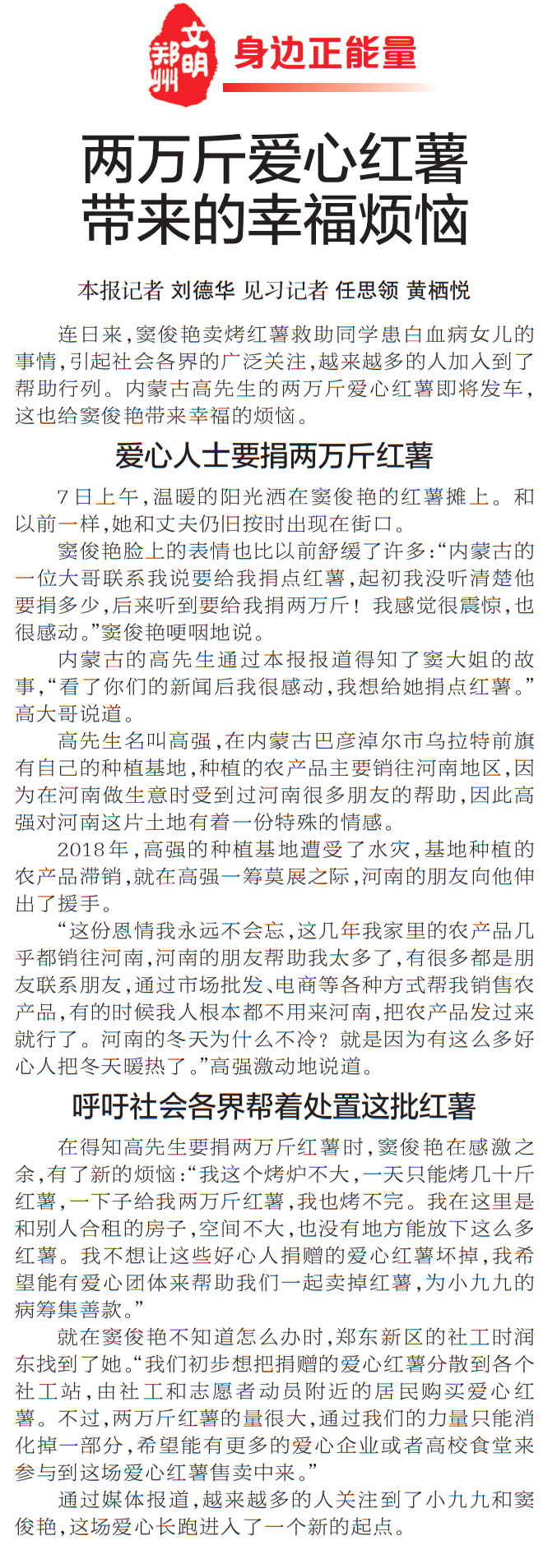 连日来,窦俊艳卖烤红薯救助同学患白血病女儿的事情,引起社会各界的广泛关注,越来越多的人加入到了帮助行列。内蒙古高先生的两万斤爱心红薯即将发车,这也给窦俊艳带来幸福的烦恼。(今日《郑州日报》3版)