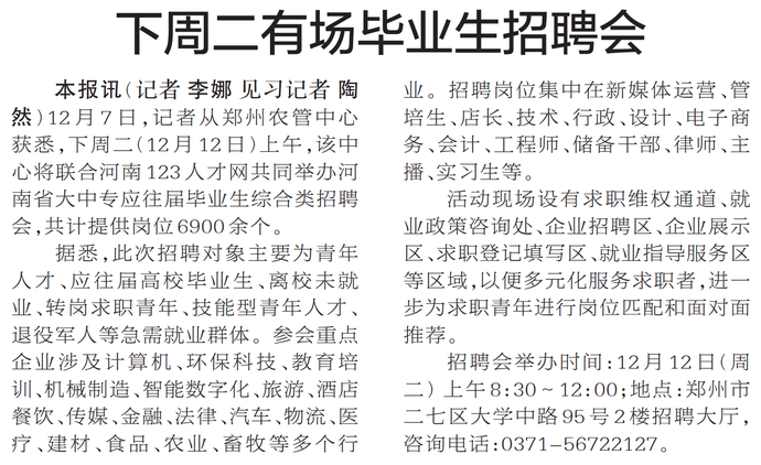 12月7日,记者从郑州农管中心获悉,下周二(12月12日)上午,该中心将联合河南123人才网共同举办河南省大中专应往届毕业生综合类招聘会,共计提供岗位6900余个。(今日《郑州日报》3版)