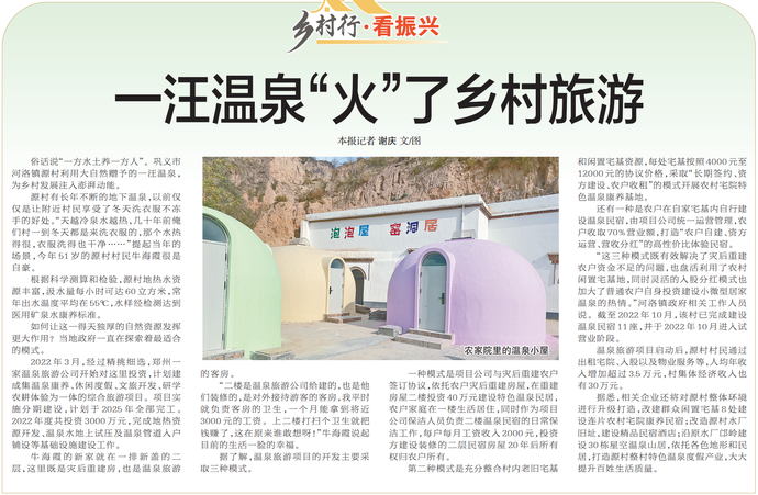 俗话说“一方水土养一方人”。巩义市河洛镇源村利用大自然赠予的一汪温泉,为乡村发展注入澎湃动能。(今日《郑州日报》5版)