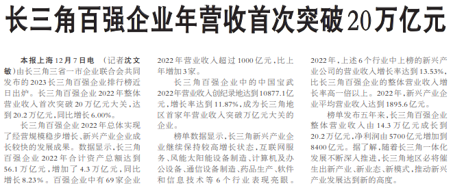 由长三角三省一市企业联合会共同发布的2023长三角百强企业排行榜近日出炉。长三角百强企业2022年整体营业收入首次突破20万亿元大关,达到20.2万亿元,同比增长6.00%。(今日《人民日报》1版)