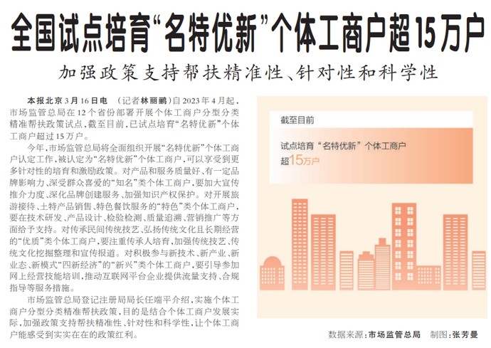 自2023年4月起,市场监管总局在12个省份部署开展个体工商户分型分类精准帮扶政策试点,截至目前,已试点培育“名特优新”个体工商户超过15万户。(今日《人民日报》1版)
