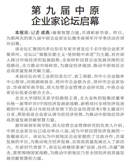 凝聚智慧力量,共谱崭新华章。昨日,为期两天的第九届中原企业家论坛暨华商领军开学季活动在郑州启幕。(今日《郑州日报》1版)
