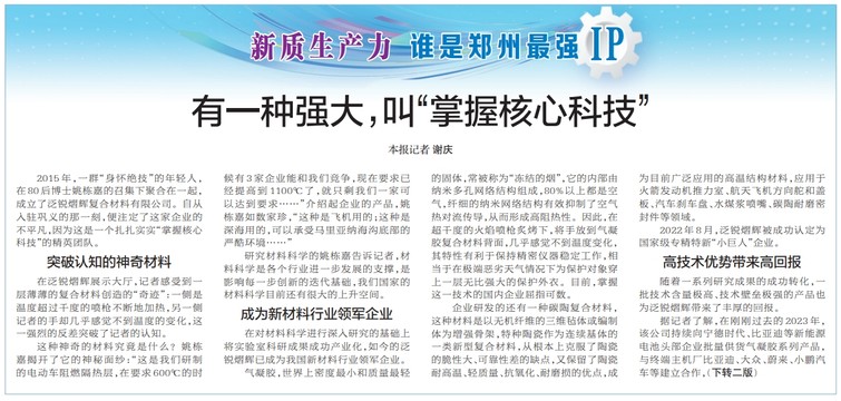 2015年,一群“身怀绝技”的年轻人,在80后博士姚栋嘉的召集下聚合在一起,成立了泛锐熠辉复合材料有限公司。自从入驻巩义的那一刻,便注定了这家企业的不平凡,因为这是一个扎扎实实“掌握核心科技”的精英团队。(今日《郑州日报》1版、2版)