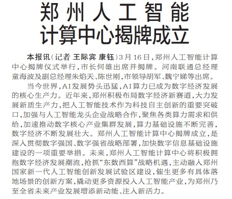 3月16日,郑州人工智能计算中心揭牌仪式举行,市长何雄出席并揭牌。河南联通总经理童海波及副总经理朱焰天、陈世刚,市领导胡军、魏宁娣等出席。(今日《郑州日报》1版、2版)