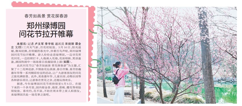 三月天气新,百花初绽放。3月16日,阳光温暖,微风轻拂,在明媚的春光中,伴着百鸟声喧,郑州绿博园问花节拉开帷幕。游人纷纷走进绿博园,一边寻花赏花问花,一边拍照打卡,人海涌入花海,花面相映、笑语盈盈,满园热闹中一场场春日浪漫陆续上演。(今日《郑州日报》1版)