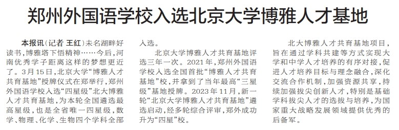 未名湖畔好读书,博雅塔下悟精神……今后,河南优秀学子距离这样的梦想更近了。3月15日,北京大学“博雅人才共育基地”授牌仪式在郑举行,郑州外国语学校入选“四星级”北大博雅人才共育基地,为本轮全国遴选最高星级,也是全省唯一四星级,数学、物理、化学、生物四个学科全部入选。(今日《郑州日报》1版)