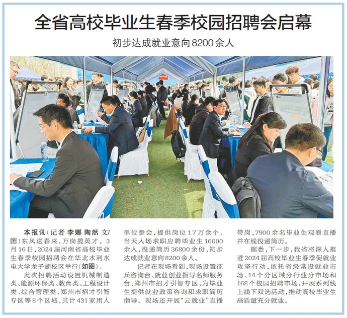 东风送春来,万岗揽英才。3月16日,2024届河南省高校毕业生春季校园招聘会在华北水利水电大学龙子湖校区举行。(今日《郑州日报》2版)
