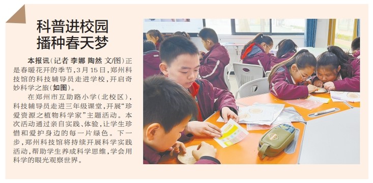 正是春暖花开的季节,3月15日,郑州科技馆的科技辅导员走进学校,开启奇妙科学之旅。(今日《郑州日报》2版)