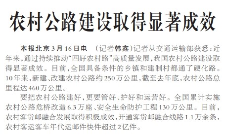 记者从交通运输部获悉:近年来,通过持续推动“四好农村路”高质量发展,我国农村公路建设取得显著成效。目前,全国具备条件的乡镇和建制村都通了硬化路。10年来,新建、改建农村公路约250万公里,截至去年底,农村公路总里程达460万公里。(今日《人民日报》1版)