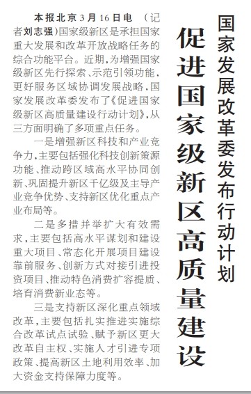 国家级新区是承担国家重大发展和改革开放战略任务的综合功能平台。近期,为增强国家级新区先行探索、示范引领功能,更好服务区域协调发展战略,国家发展改革委发布了《促进国家级新区高质量建设行动计划》,从三方面明确了多项重点任务。(今日《人民日报》1版)