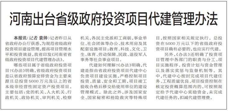 记者昨日从省政府办公厅获悉,为规范省级政府投资项目建设管理,提高项目管理水平和投资效益,我省印发《河南省省级政府投资项目代建管理办法》。(今日《郑州日报》1版)