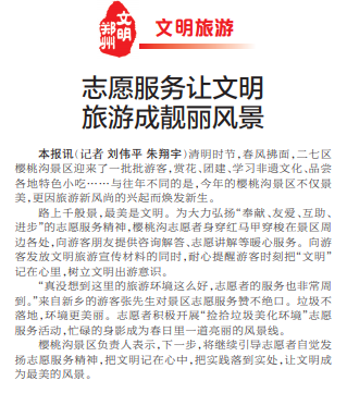 清明时节,春风拂面,二七区樱桃沟景区迎来了一批批游客,赏花、团建、学习非遗文化、品尝各地特色小吃……与往年不同的是,今年的樱桃沟景区不仅景美,更因旅游新风尚的兴起而焕发新生。(今日《郑州日报》1版)