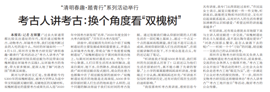 “过去大家通常都比较关注遗址的年代,现在通过植物考古、动物考古、环境考古等,我们还能判断过去的人吃的是什么,当时的环境如何……”4月5日,郑州市文物考古研究院“清明春趣·踏青行”系列活动之“考古人讲考古”举行,邀请副研究馆员胡亚毅为市民带来《双槐树遗址环境考古实践》,从环境考古的角度,带大家多侧面、更深入地了解“河洛古国”的真实面貌。(今日《郑州日报》1版)