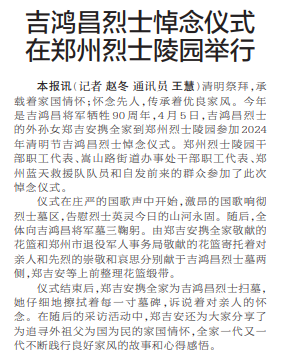 清明祭拜,承载着家国情怀;怀念先人,传承着优良家风。今年是吉鸿昌将军牺牲90周年,4月5日,吉鸿昌烈士的外孙女郑吉安携全家到郑州烈士陵园参加2024年清明节吉鸿昌烈士悼念仪式。郑州烈士陵园干部职工代表、嵩山路街道办事处干部职工代表、郑州蓝天救援队队员和自发前来的群众参加了此次悼念仪式。(今日《郑州日报》2版)