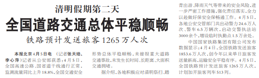 记者从公安部获悉:4月5日,全国高速公路、国省道干线通行正常,监测流量同比上升18.8%,全国交通安全形势总体平稳顺畅,未接报重大道路交通事故,未发生长时间、长距离、大面积交通拥堵。(今日《人民日报》1版)
