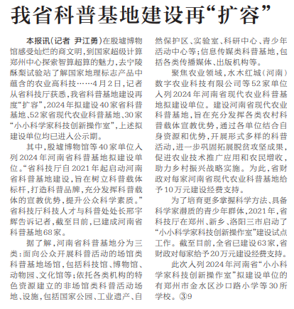 在殷墟博物馆感受灿烂的商文明,到国家超级计算郑州中心探索智算超算的魅力,去宁陵酥梨试验站了解国家地理标志产品中蕴含的农业高科技……4月2日,记者从省科技厅获悉,我省科普基地建设再度“扩容”,2024年拟建设40家省科普基地、52家省现代农业科普基地、30家“小小科学家科技创新操作室”,上述拟建设单位均已进入公示期。(今日《河南日报》1版)