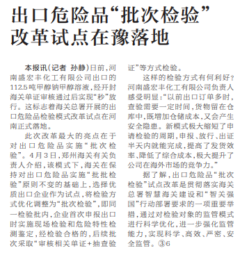 日前,河南盛宏丰化工有限公司出口的112.5吨甲醇钠甲醇溶液,经开封海关单证审核通过后实现“秒”放行。这标志着海关总署开展的出口危险品检验模式改革试点在河南正式落地。(今日《河南日报》2版)