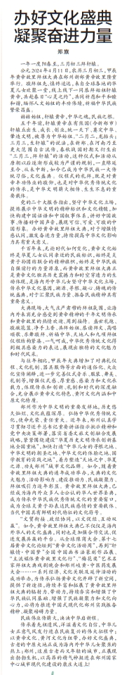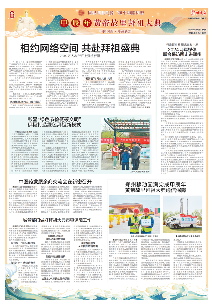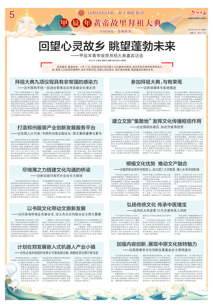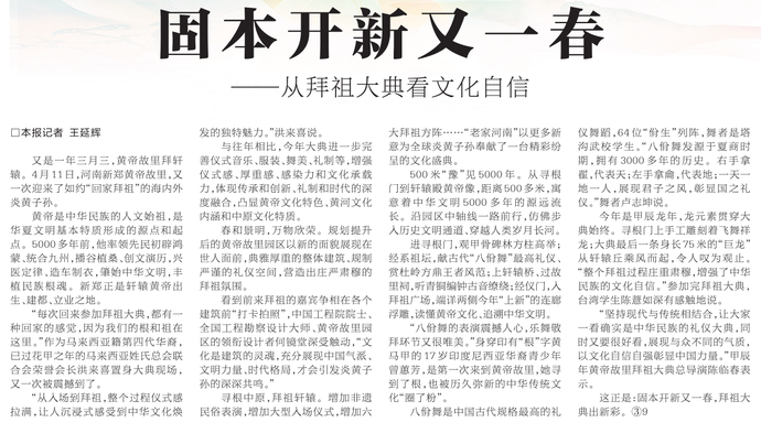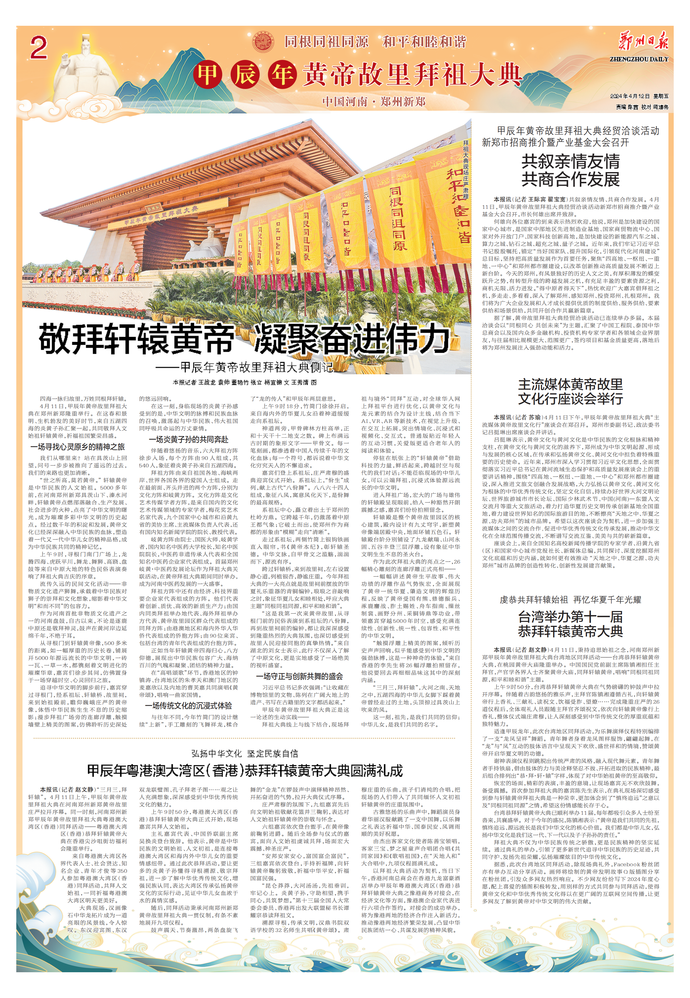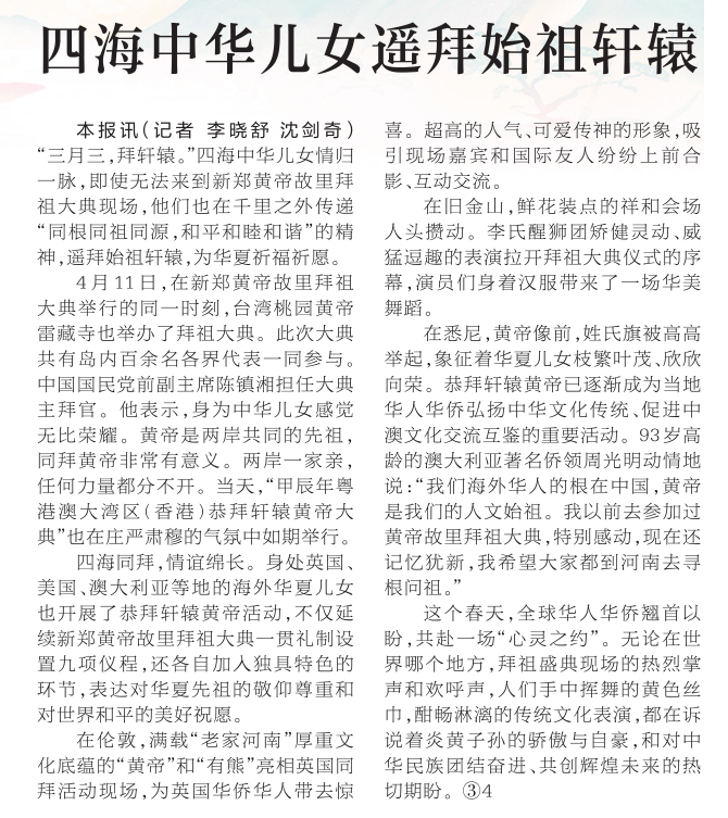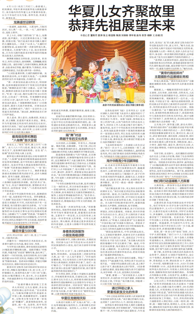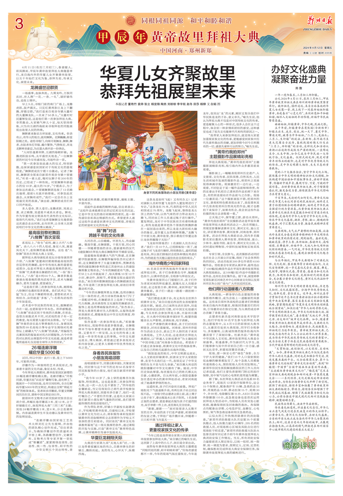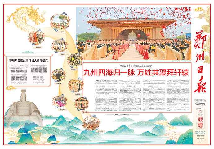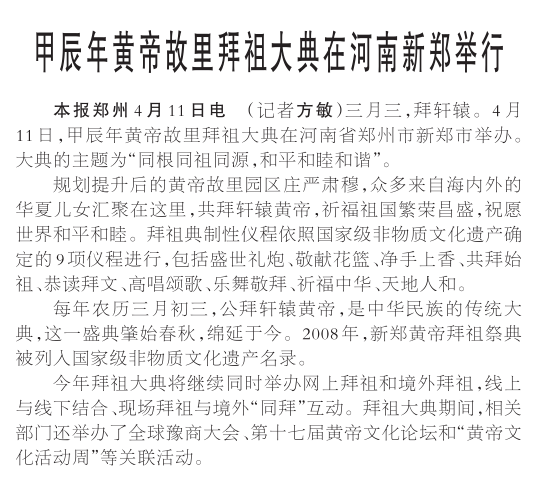 4月11日(农历三月初三),春意暖人,和风拂面,甲辰年黄帝故里拜祖大典隆重举行,来自海内外的华夏儿女齐聚黄帝故里,以五千年灿烂文化为鉴,恭拜先祖,传承文化,展望未来。(今日《郑州日报》3版)