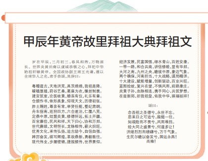 岁在甲辰,三月初三,春风和煦,万物滋长。世界炎黄后裔以虔诚恭敬之心,拜祀中华始祖轩辕黄帝。全国政协副主席王光谦,谨以全球华人之名,肃手恭颂,其辞曰:(今日《郑州日报》1版)