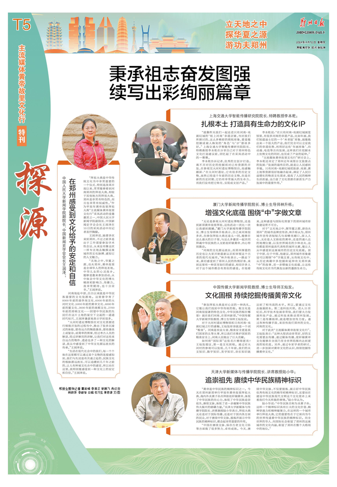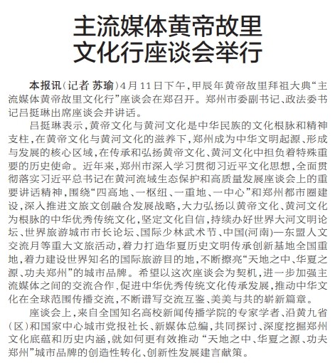 4月11日下午,甲辰年黄帝故里拜祖大典“主流媒体黄帝故里文化行”座谈会在郑召开。郑州市委副书记、政法委书记吕挺琳出席座谈会并讲话。(今日《郑州日报》2版)