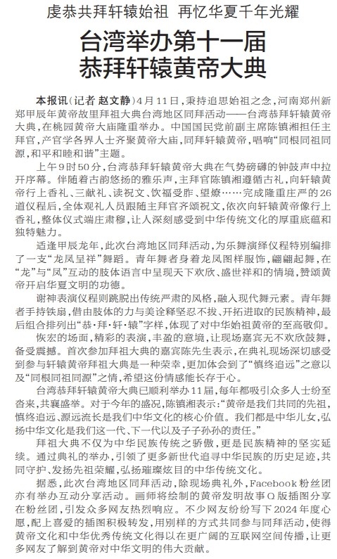 4月11日,秉持追思始祖之念,河南郑州新郑甲辰年黄帝故里拜祖大典台湾地区同拜活动——台湾恭拜轩辕黄帝大典,在桃园黄帝大庙隆重举办。中国国民党前副主席陈镇湘担任主拜官,产官学各界人士齐聚黄帝大庙,同拜轩辕黄帝,唱响“同根同祖同源,和平和睦和谐”主题。(今日《郑州日报》2版)