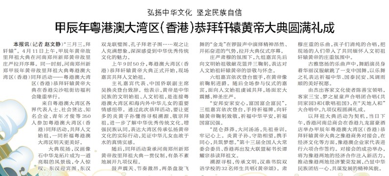 “三月三,拜轩辕”。4月11日上午,甲辰年黄帝故里拜祖大典在河南郑州新郑黄帝故里庄严拉开序幕。同一时刻,河南郑州新郑甲辰年黄帝故里拜祖大典粤港澳大湾区(香港)同拜活动——粤港澳大湾区(香港)恭拜轩辕黄帝大典在香港尖沙咀街坊福利会隆重举行。(今日《郑州日报》2版)