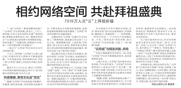 “一起‘云拜祖’,愿祖国繁荣昌盛!”“‘云拜祖’平台很流畅,很走心,三月三,拜轩辕,中华儿女应有的仪式感”“画面很赞,熊熊跃动真的好玩,每一跳都有知识点”“AI游故里合成的图片和视频美美哒,发朋友圈了”“龙腾四海,炫酷的灯光秀,每一个细节都充满了科技魅力”。(今日《郑州日报》6版)