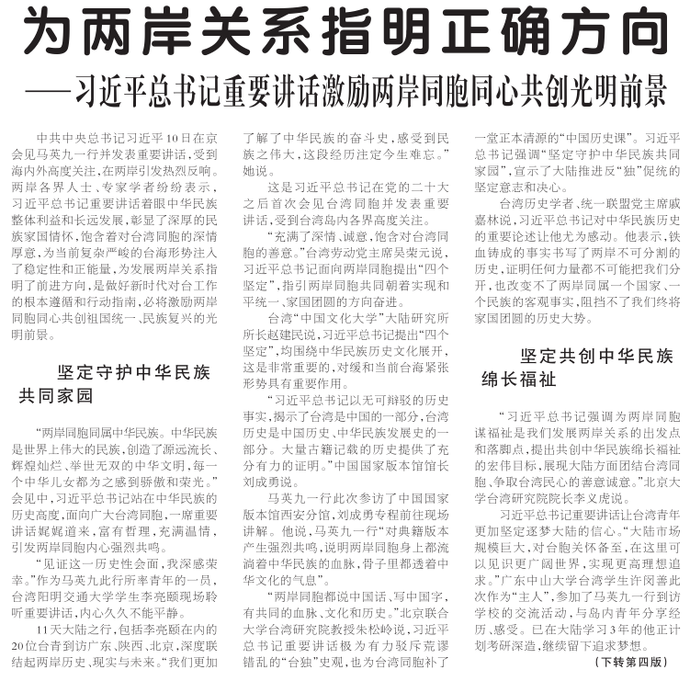 中共中央总书记习近平10日在京会见马英九一行并发表重要讲话,受到海内外高度关注,在两岸引发热烈反响。两岸各界人士、专家学者纷纷表示,习近平总书记重要讲话着眼中华民族整体利益和长远发展,彰显了深厚的民族家国情怀,饱含着对台湾同胞的深情厚意,为当前复杂严峻的台海形势注入了稳定性和正能量,为发展两岸关系指明了前进方向,是做好新时代对台工作的根本遵循和行动指南,必将激励两岸同胞同心共创祖国统一、民族复兴的光明前景。(今日《人民日报》1版、4版)