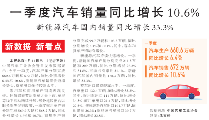 中国汽车工业协会近日发布数据显示:今年一季度,汽车产销分别完成660.6万辆和672万辆,同比分别增长6.4%和10.6%,新能源汽车延续快速增长势头,整车出口保持较高水平。(今日《人民日报》1版)