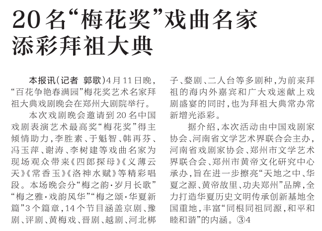 4月11日晚,“百花争艳春满园”梅花奖艺术名家拜祖大典戏剧晚会在郑州大剧院举行。(今日《河南日报》2版)