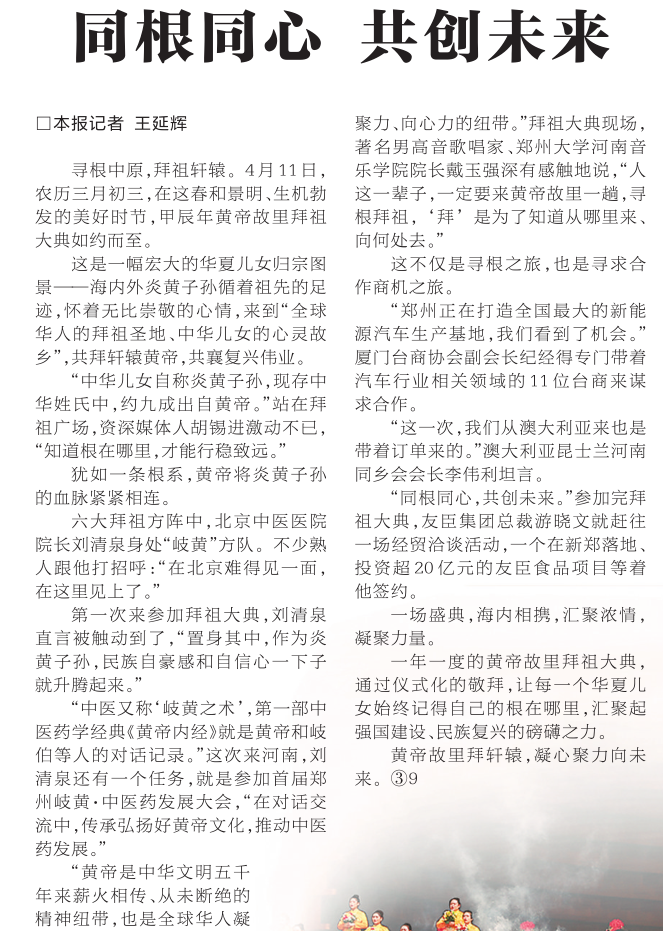 这是一幅宏大的华夏儿女归宗图景——海内外炎黄子孙循着祖先的足迹,怀着无比崇敬的心情,来到“全球华人的拜祖圣地、中华儿女的心灵故乡”,共拜轩辕黄帝,共襄复兴伟业。(今日《河南日报》2版)