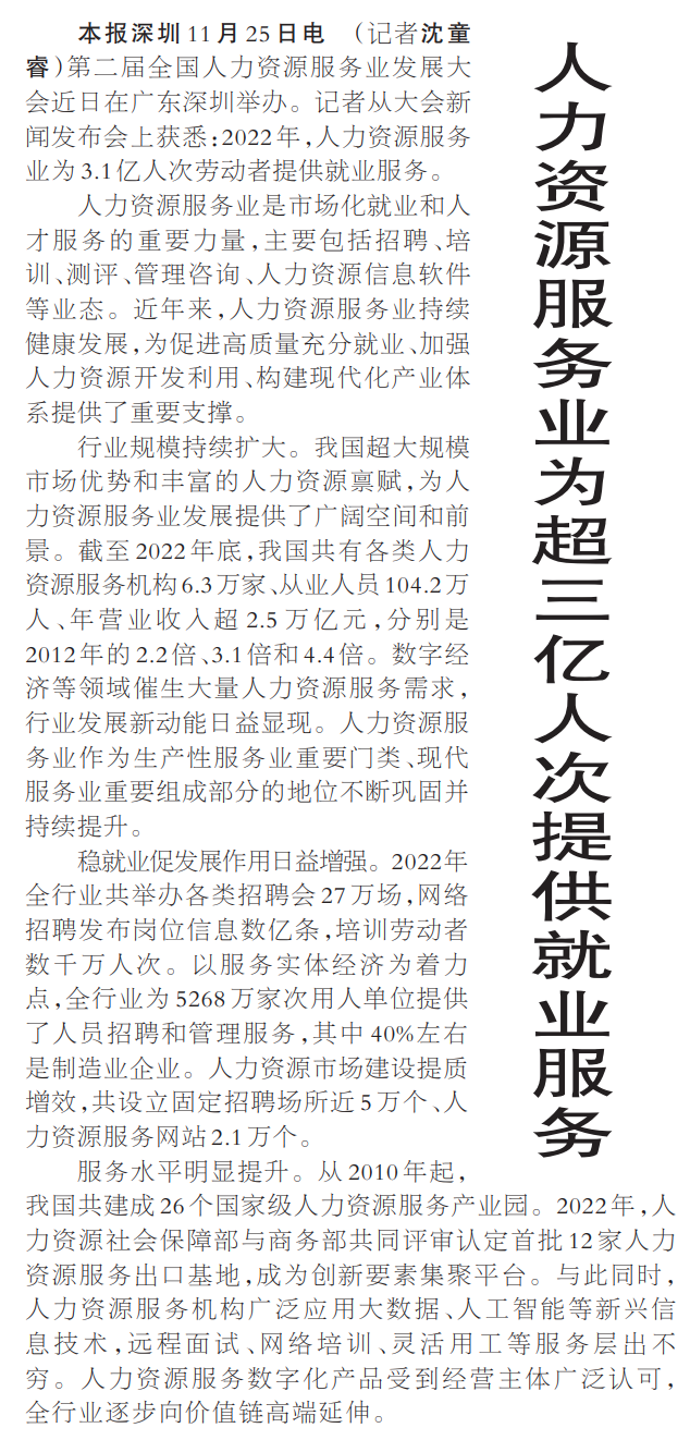 第二届全国人力资源服务业发展大会近日在广东深圳举办。记者从大会新闻发布会上获悉:2022年,人力资源服务业为3.1亿人次劳动者提供就业服务。(今日《人民日报》1版)