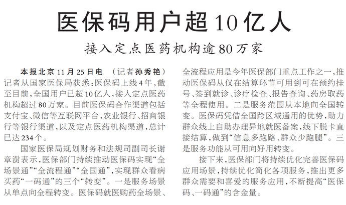 医保码用户超10亿人