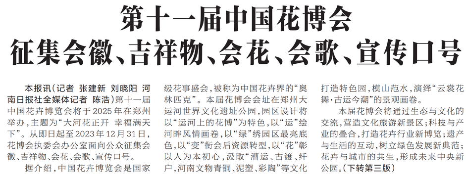 第十一届中国花卉博览会将于2025年在郑州举办,主题为“大河花正开幸福满天下”。从即日起至2023年12月31日,花博会执委会办公室面向公众征集会徽、吉祥物、会花、会歌、宣传口号。(今日《河南日报》1版、3版)