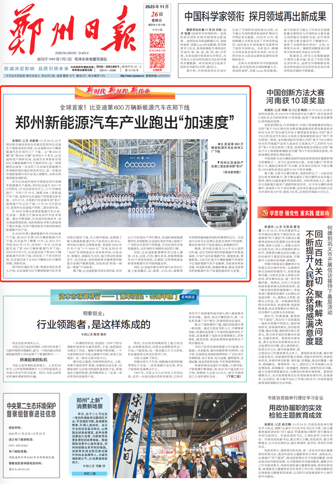 11月24日,位于郑州航空港经济综合实验区的郑州比亚迪生产基地传来好消息,比亚迪第600万辆新能源汽车在郑州工厂下线。从“第500万辆”到“第600万辆”仅用时3个多月,比亚迪再创产销新纪录,也成为全球首家实现600万辆新能源汽车下线的车企,这一里程碑的达成进一步证明了比亚迪在新能源汽车领域的领先地位和技术实力,进一步推动中国新能源汽车行业进入规模化、全球化的高质量发展阶段。(今日《郑州日报》1版)