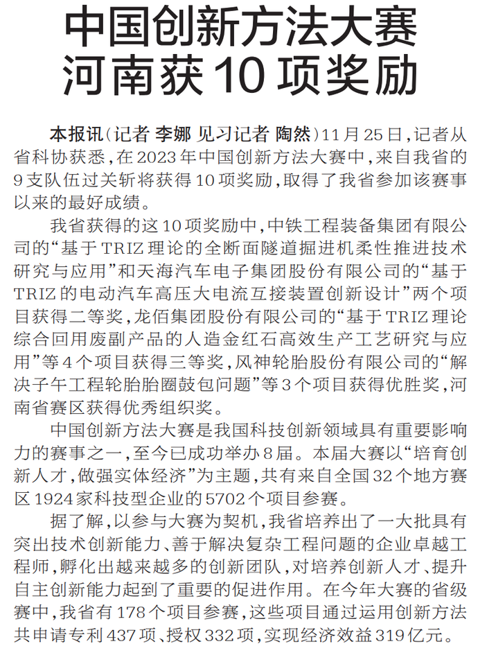 11月25日,记者从省科协获悉,在2023年中国创新方法大赛中,来自我省的9支队伍过关斩将获得10项奖励,取得了我省参加该赛事以来的最好成绩。(今日《郑州日报》1版)
