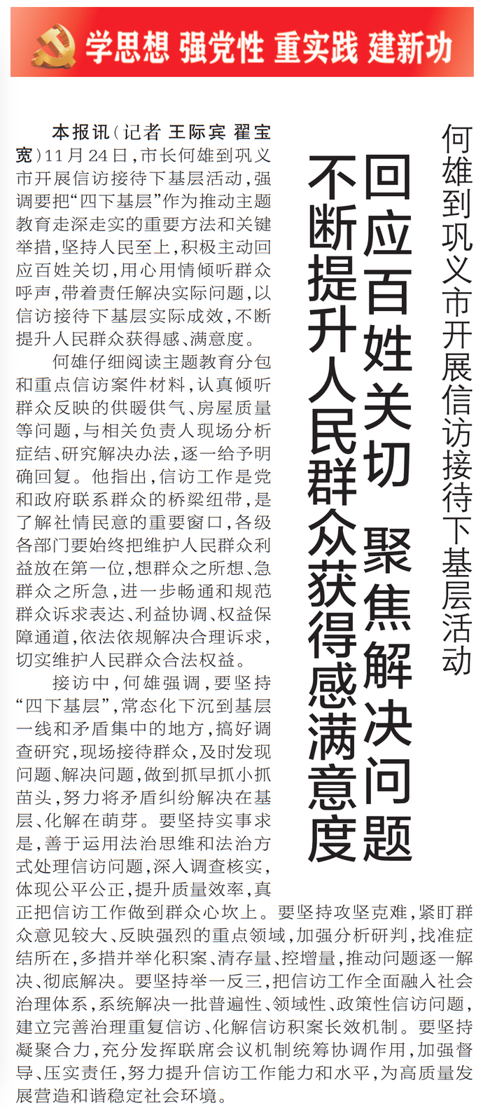 11月24日,市长何雄到巩义市开展信访接待下基层活动,强调要把“四下基层”作为推动主题教育走深走实的重要方法和关键举措,坚持人民至上,积极主动回应百姓关切,用心用情倾听群众呼声,带着责任解决实际问题,以信访接待下基层实际成效,不断提升人民群众获得感、满意度。(今日《郑州日报》1版)